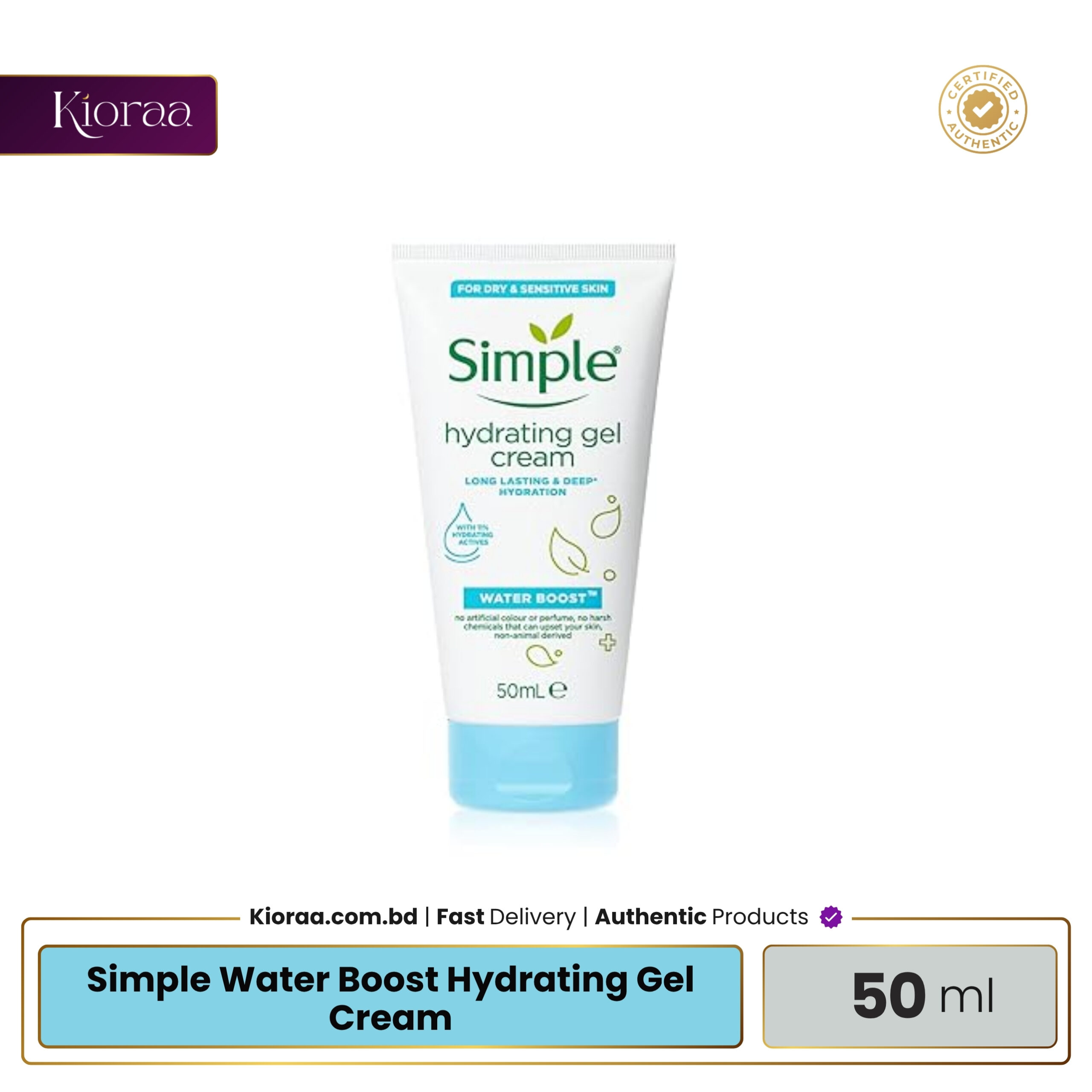 Simple Water Boost Hydrating Gel Cream 50ml is a lightweight, fast-absorbing moisturizer. It delivers intense hydration without greasiness. The formula keeps skin soft and supple in humid or dry weather. It contains a triple blend of hyaluronic acid, mineral water, and betaine. These ingredients replenish moisture and strengthen the skin barrier. The gel leaves a dewy, refreshed finish after every use. It has no artificial fragrance, color, parabens, or alcohol. The formula is dermatologically tested and safe for sensitive or oily skin. It suits all skin types, even delicate complexions. Perfect for daily use in Bangladesh’s tropical climate, it locks in hydration while feeling light and breathable. You can wear it comfortably under makeup or sunscreen. It keeps skin smooth, hydrated, and plump throughout the day.