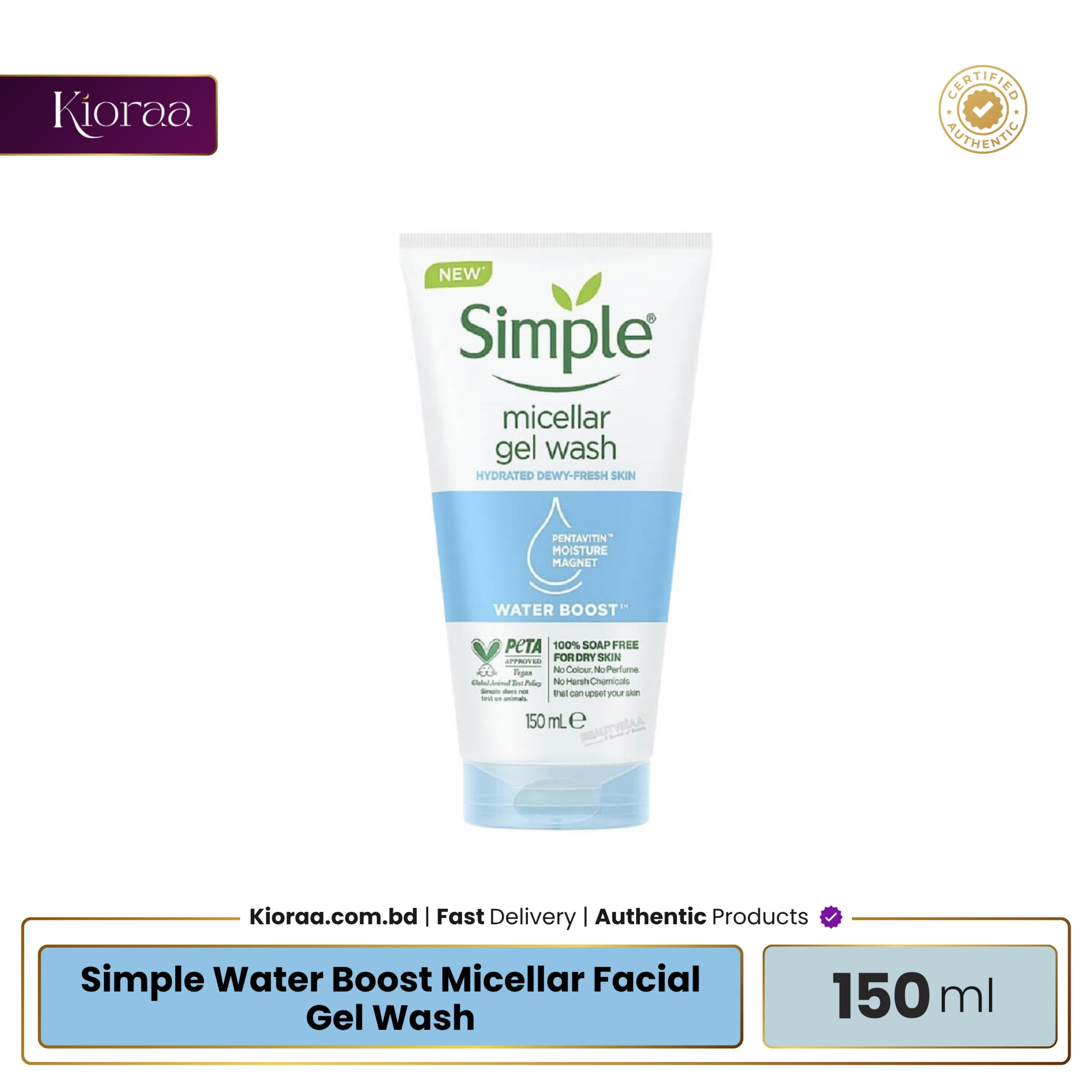 Simple Water Boost Micellar Facial Gel Wash 150ml is a gentle, hydrating cleanser that effortlessly removes makeup, dirt, and impurities while infusing skin with lasting moisture. This innovative micellar gel formula combines the power of micelles—tiny cleansing molecules—with a triple hyaluronic acid complex and mineral-rich water to purify without stripping the skin’s natural barrier. Free from soap, alcohol, parabens, artificial fragrances, and colors, it’s dermatologically tested and ideal for all skin types, including sensitive and dehydrated. Perfect for Bangladesh’s humid climate, this 150ml pump bottle delivers a refreshing, non-drying clean that leaves skin soft, balanced, and ready for the next steps in your routine.